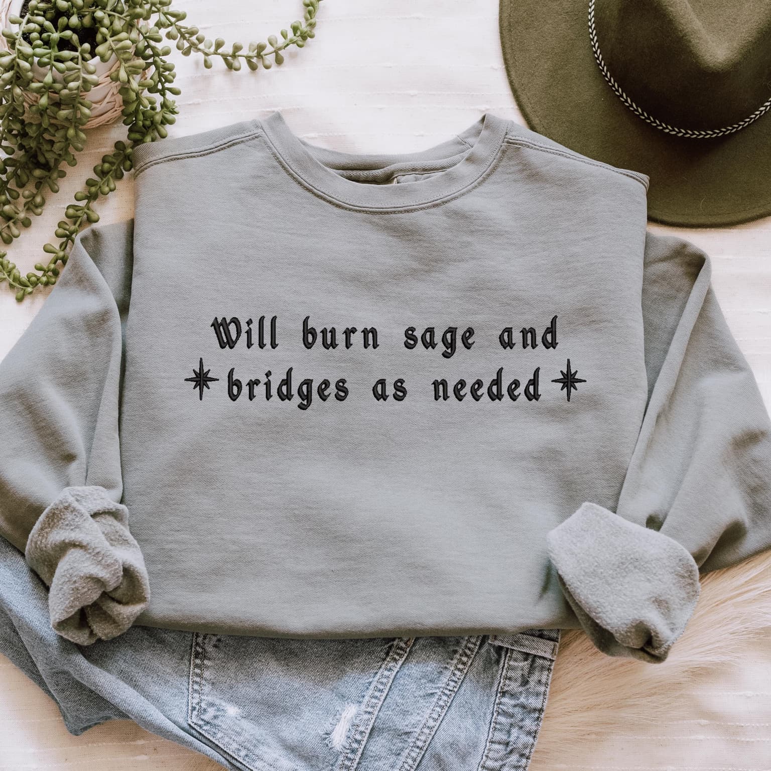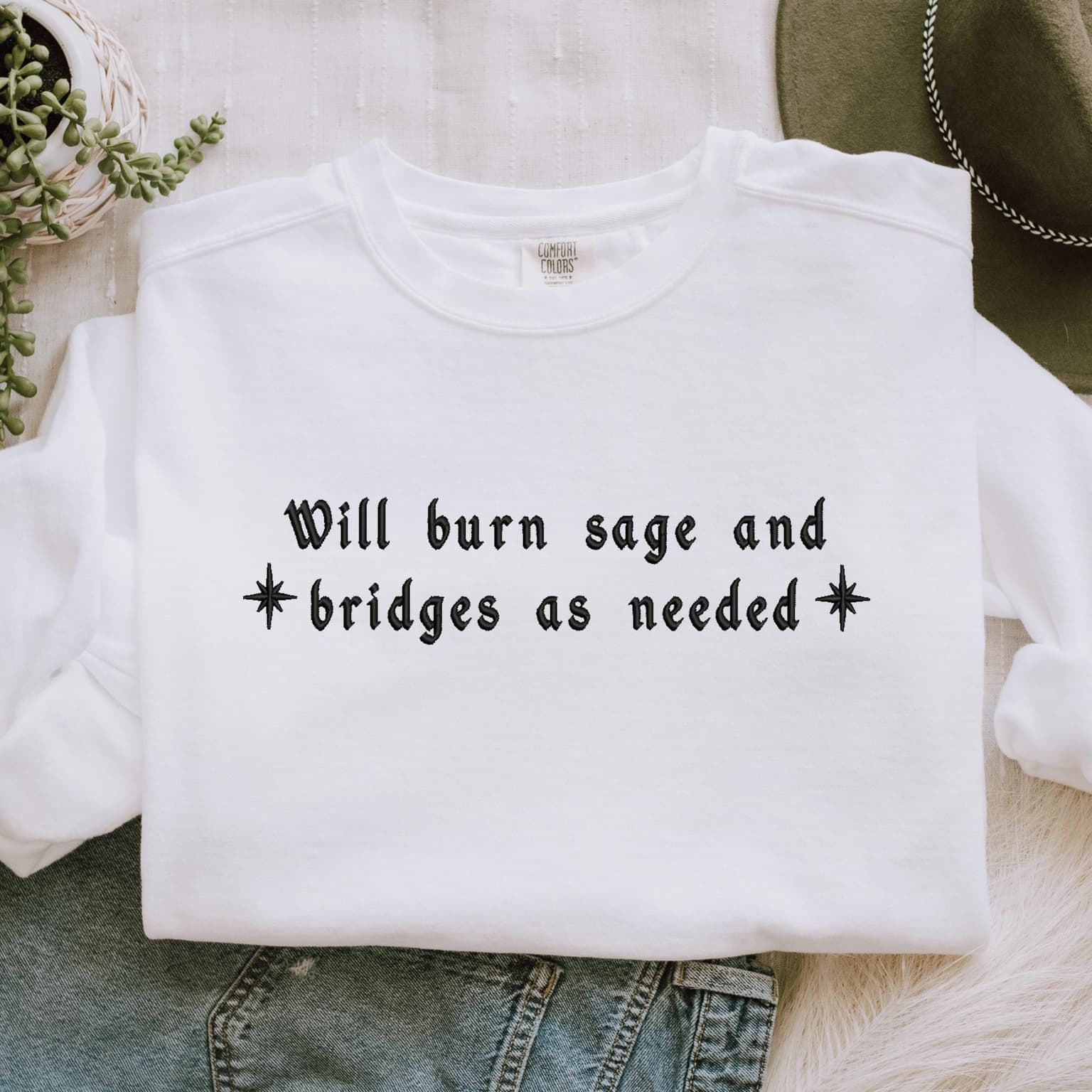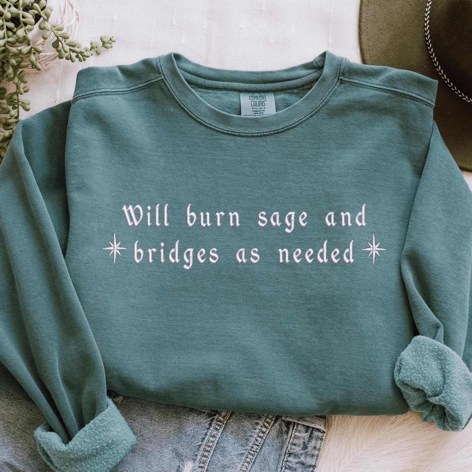 Embroidered Comfort Colors Will Burn Sage And Bridges As Needed Sweatshirt, Celestial Vibes, Witchy Sweatshirt, Positive Vibes